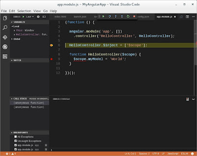 The differences between generated and this configuration sre that the port was changed from 8080 to 3000 as this is the default port for lite-server and the preLaunchTask was added that starts the server using previously configured task. Now we can launch our application using F5 button, set breakpoint, add watches, etc. After launching the application, to hit breakpoints press Restart button or press Ctrl-Shift-F5.